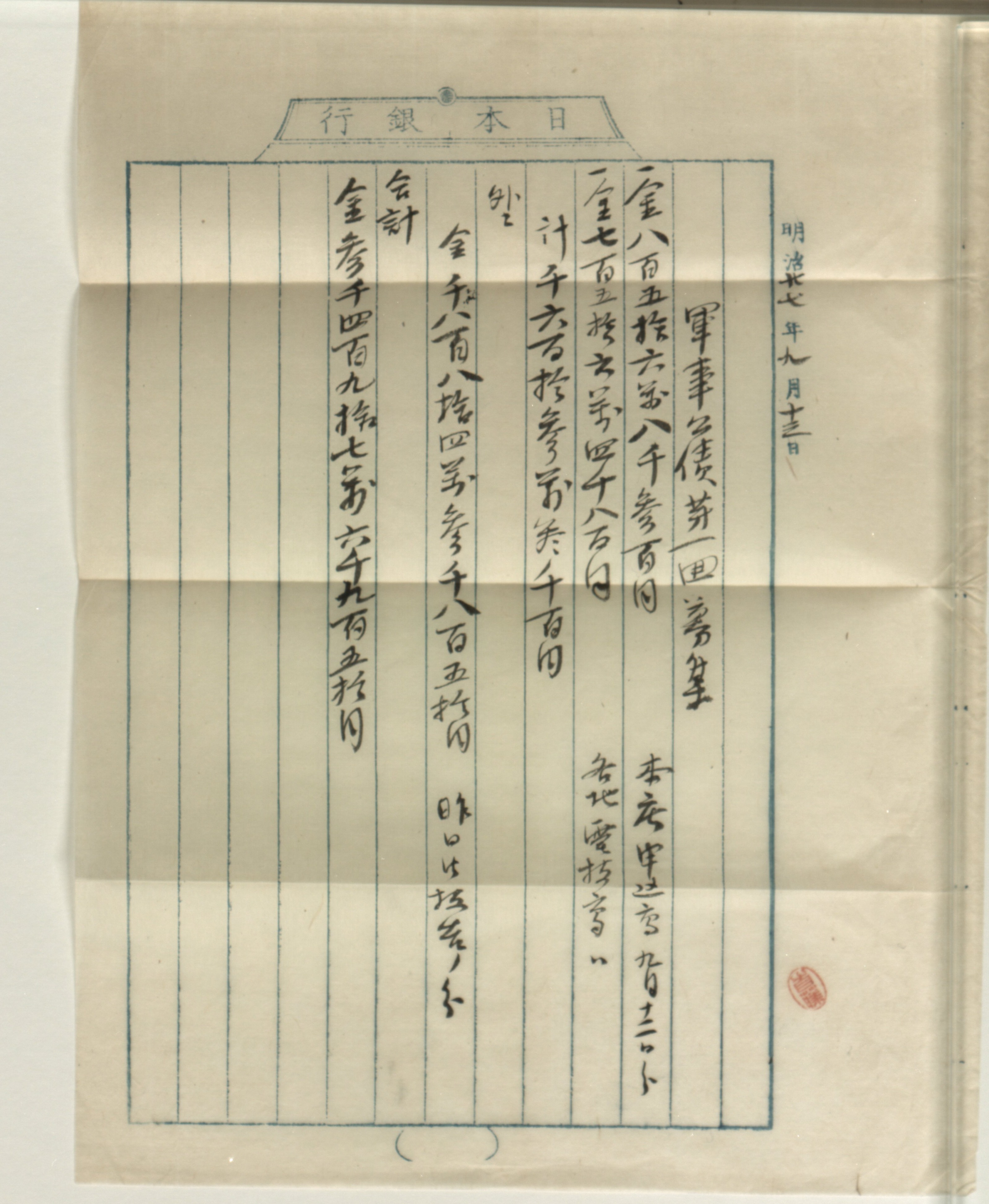 | 解説 | 首藤諒から川田小一郎宛書簡です。 明治27(1894)年8月の日清戦争開戦後、国内では直ちに戦費を調達するために第1回の軍事公債募集が行われています。画像は、10万円以上の公債を引き受けた金融機関について、理事の首藤諒が川田に報告したものです。 |
