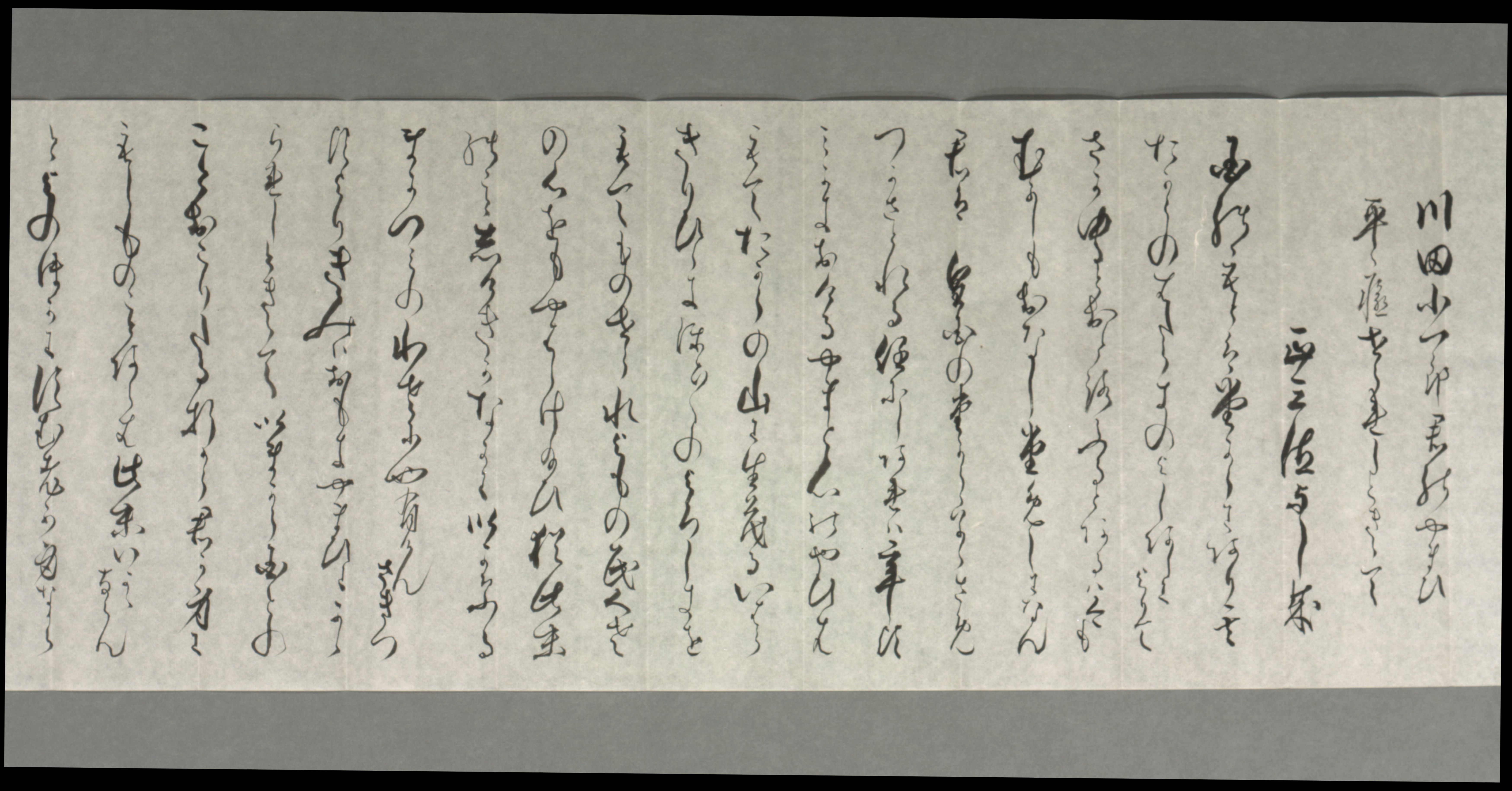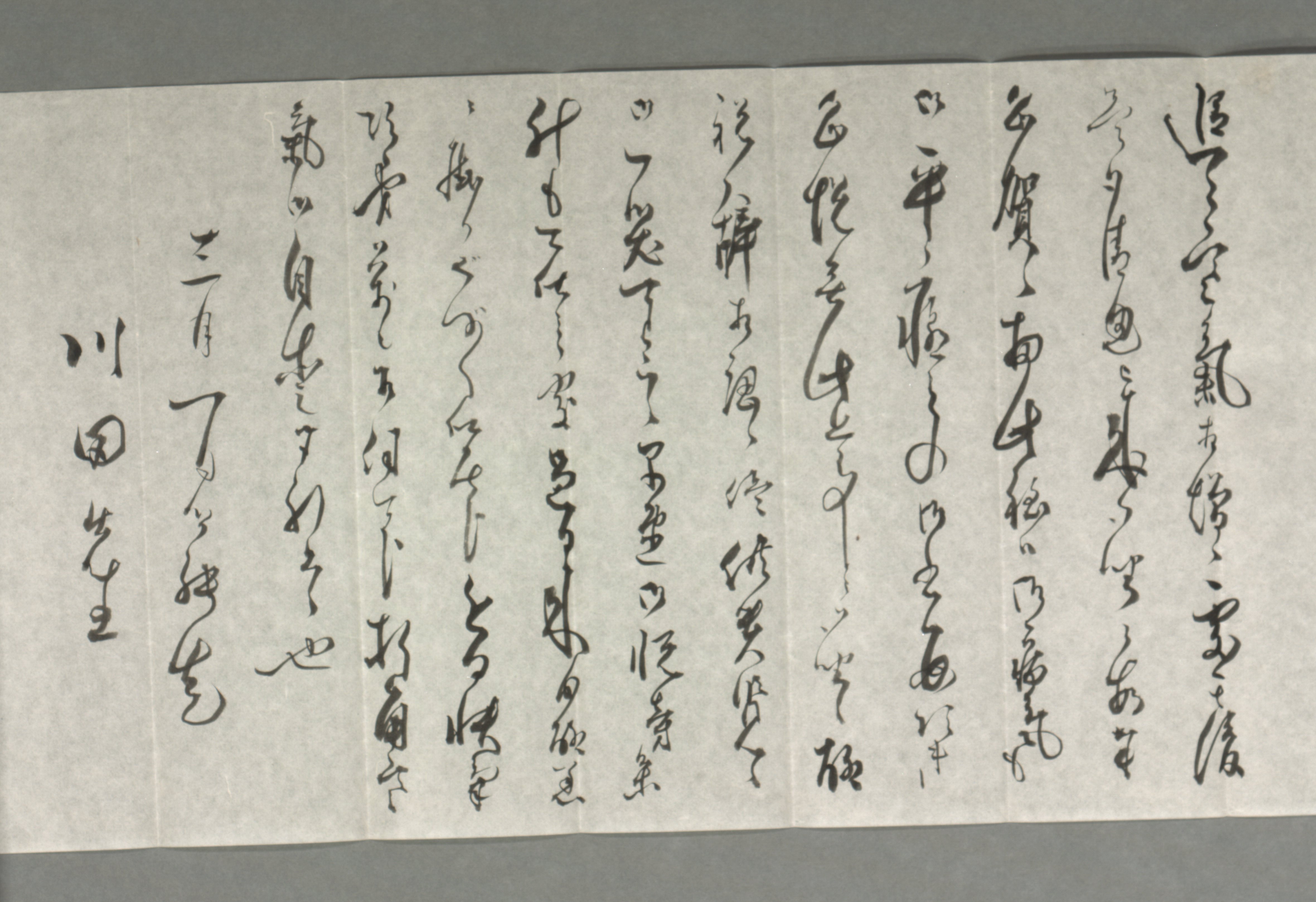 | 解説 | 郷純造から川田小一郎宛書簡です。 郷純造は元幕臣で、明治維新後は新政府に入り大蔵大輔(おおくらたいふ。当時の大蔵省の次官職)を務め、退任後は貴族院議員となった人物です。書簡は「川田小一郎君のやまひ平癒をうれしくききて」から始まるもので、当時始まっていた日清戦争における旅順口戦勝の報告と合わせて川田の平癒を祝ったものです。 |