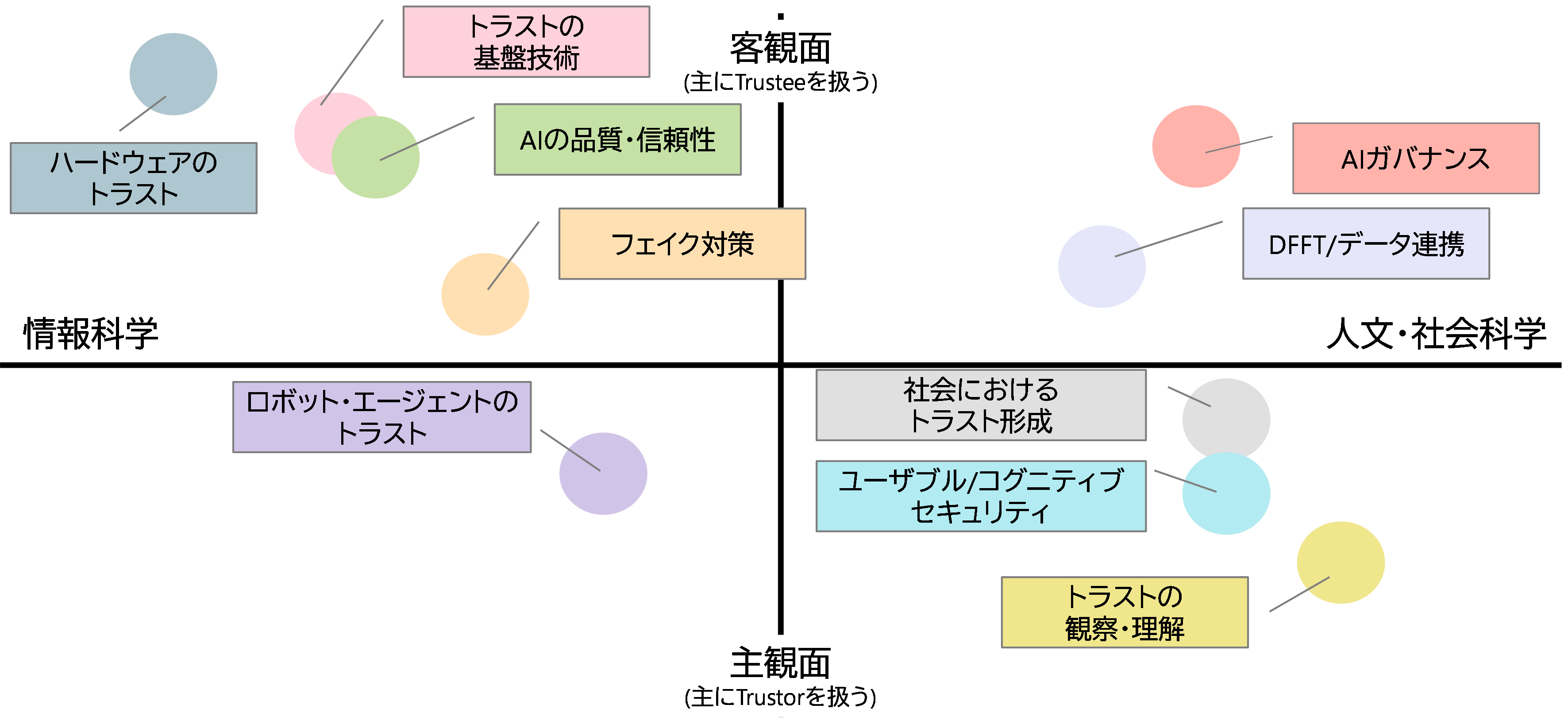 最後に、トラスト研究におけるアプローチの多様化について紹介がありました。近年のトラスト研究では、個別分野の知見に基づく研究や技術開発のみではなく、社会全体としてトラストの形成を支える仕組みや制度設計を検討することや、新たな技術や制度を開発する際に、それが社会に受け容れられるかを念頭におくことの必要性が意識されています。また、信頼する側(Trustor)と信頼される側(Trustee)の両面からのアプローチに加えて、情報科学に基づく客観面からのアプローチと人文・社会科学に基づく主観面からのアプローチの必要性も意識されています。こうした問題意識から、異なる学問分野の間を自由に往来できるトラスト研究人材の育成や、研究コミュニティの形成を企図したワークショップの試みについても紹介がありました。